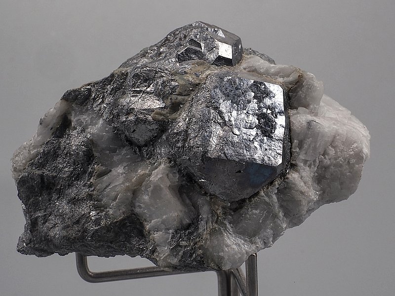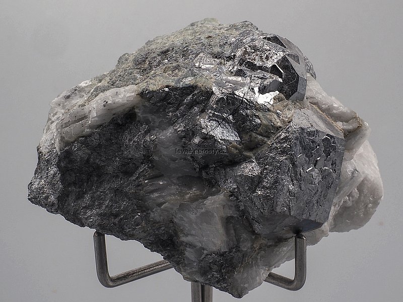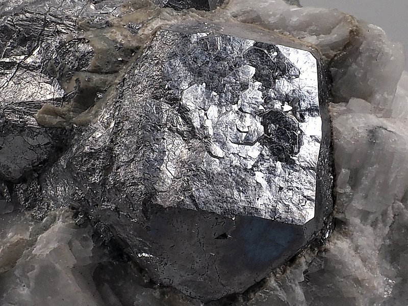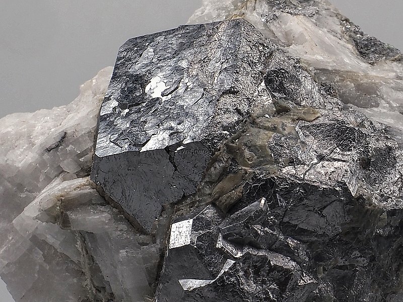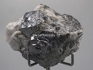 Stříbrně kovově lesklé krystaly skuteruditu částečně prorostlé kalcitem.